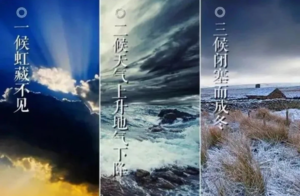 一候虹藏不见。这里的“虹”指的就是雨后的彩虹,一般在夏季的时候,雨后在阳光的作用下偶尔会有彩虹出现,而彩虹的出现需要雨水,需要阳光,也需要温度。小雪节气到来之后,气温非常低,雨水在低温下便会形成了冰雪,所以彩虹也就不会在这个时节出现了。