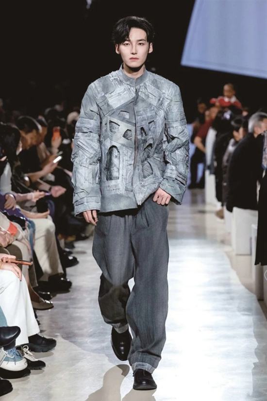 在时尚100项目的展厅里,服装被赋予了更多可能性。《在场》系列以“在场性”为核心概念,从“观看—被看”的视觉结构出发,关注服装如何在社会语境中塑造个体形象与身份表达,该系列运用羽毛、烫钻、印花等材料与工艺,通过不同材质的属性与质感差异、图像呈现与视觉叙事,在材料、结构与视觉关系中形成关于“在场性”的表达。《物质骨骼·花骨》系列以“骨”之秩序承载“花”之生长,呈现一种在结构与变化之间持续演化的当代穿戴范式。作品采用全3D打印的一体化柔性织物结构,形成可弯折、可贴合的“柔性骨骼”,同时在织物表面引入标准化接口与可插拔模块——花朵组件可随时拆卸、转位与重组,令服装在时间维度中可以不断“再配置”。该系列延续作者对“人机协作与规则重塑”的长期研究,将生成逻辑体现在材料组织之中,回应“当形态可以被快速生产,真正的价值在于可迭代的系统、可复用的结构语言,和面向未来的数字物质性”等AIGC(人工智能生成内容)语境下的时代命题。另一组《风迹·石窟》系列则用服饰诠释传统,作品以千年石窟的风蚀肌理为灵魂,创新融合夏布的粗粝经纬、麻布的天然褶皱、皮棉纸的斑驳细韧与纸浆塑形的凹凸层次。通过手工揉皱、层叠拼贴与矿物染色工艺,让服装表面呈现岩壁剥落、沙砾沉积的立体触感,每一处褶皱皆如风沙刻下的时间印记,以材质本身诉说沧桑。