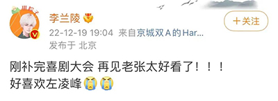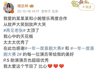 “你们是名副其实的舞台强者,每一个作品都不断向我们展示着什么是专业,什么是人物,什么是十年磨一剑。爱与坚持是你们永恒的主题,你们对舞台永远敬畏,对真人秀镜头永远敬而远之。你们不再是不知名的某某某,愿你们继续和有情人做欢喜事。”