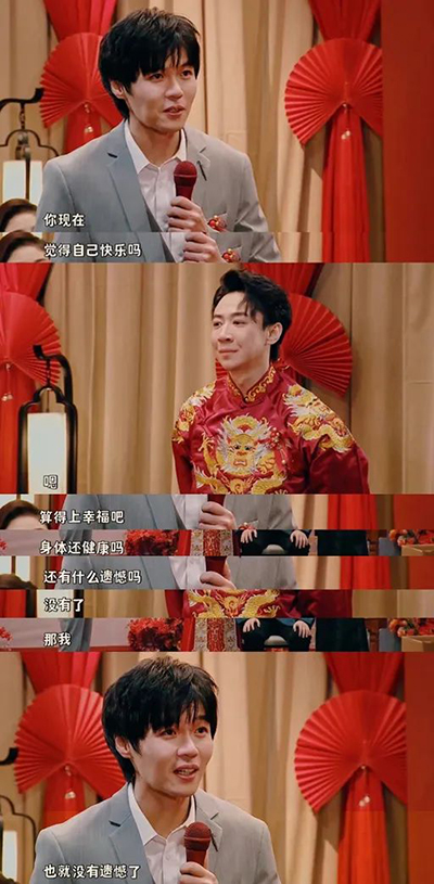 《再见老张》中,张维伊向天使刘同许愿成功,父亲如愿附身于好友左凌峰,重返人间参加儿子的婚礼。在老张停留在人间最后的十分钟里,张维伊想尽办法给婚礼彩排开了“倍速”,实现了让父亲看见自己婚礼的愿望。