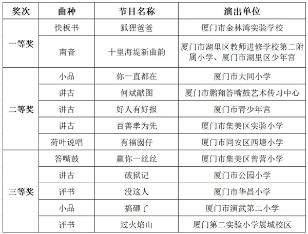近日,由福建省文学艺术界联合会、福建省教育厅联合主办,福建省曲艺家协会承办的“曲赞新时代 童心筑梦想”第六届福建省曲艺丹桂奖少儿大赛评奖结果公布。由厦门市文学艺术界联合会、厦门市教育局、厦门市曲艺家协会联合报送的多件曲艺作品荣获奖项。