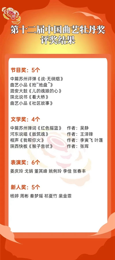 本届中国曲艺牡丹奖共收到来自中国曲协32家团体会员、艺委会、曲艺联盟、中直文艺院团、省级文化馆以及香港、澳门、台湾地区有关团体报送的涵盖120个曲种的472个节目,报送数量为历届之最。经初评、4个分赛区比赛、终评,共评出节目奖5个、表演奖6个、文学奖4个、新人奖5个。颁奖仪式上,还为苏州评弹表演艺术家赵开生、河南坠子表演艺术家马玉萍、二人转表演艺术家蔡兴林颁发“中国文联终身成就曲艺艺术家”荣誉称号,褒扬三位艺术家在曲艺艺术方面取得的卓越成就、为曲艺事业作出的杰出贡献。