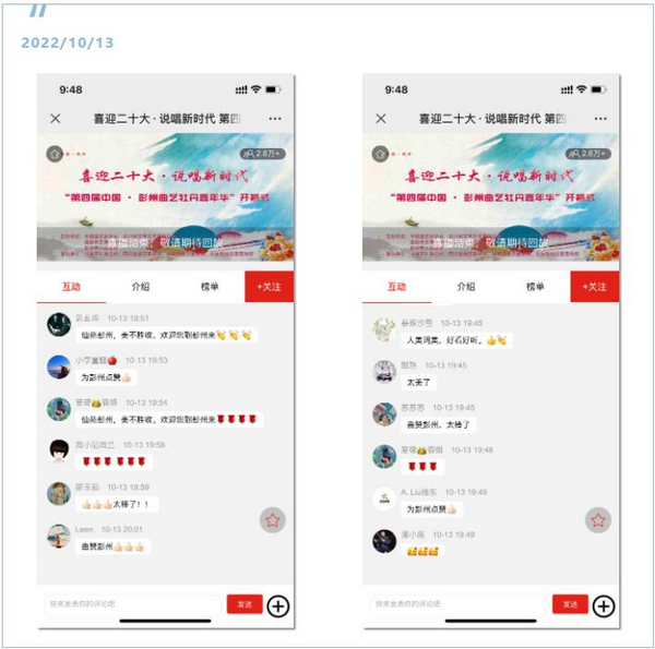 礼赞新时代,奋进新征程。此次活动在全国人民翘首迎接即将开幕的党的二十大的浓厚氛围中成功举办,既是曲艺工作者喜迎党的二十大的务实行动,也是以曲艺艺术的传承、创新、发展成果为媒,细说经济社会发展,唱赞人民美好生活,展示“中国曲艺名城”风采的具体举措。广大曲艺爱好者在留言中纷纷表示,将深刻领悟“两个确立”的决定性意义,增强“四个意识”、坚定“四个自信”、做到“两个维护”,更加紧密地团结在以习近平同志为核心的党中央周围,全面贯彻习近平新时代中国特色社会主义思想,自觉肩负起“举旗帜、聚民心、育新人、兴文化、展形象”的使命任务,唱响主旋律、弘扬正能量,踔厉奋发、勇毅前行,为全面建设社会主义现代化国家、全面推进中华民族伟大复兴贡献力量,以优异的成绩迎接党的二十大胜利召开。
