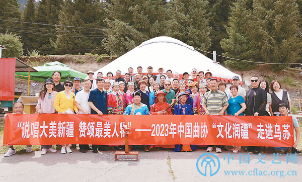 “说唱大美新疆赞颂最美人物”——2023年中国曲协“文化润疆”系列活动中,采风团一行与乌苏民间艺人合影。