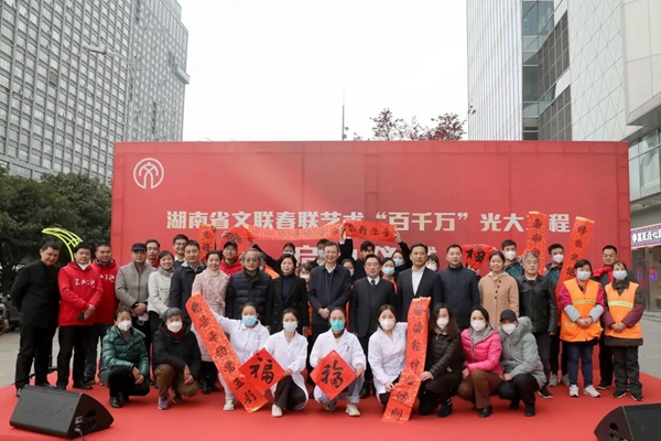 为深入贯彻落实党的二十大精神,厚植中华民族生生不息的优秀传统文化,2023年1月9日,湖南省文联正式启动“春联艺术百千万光大工程”。截至1月20日,湖南全省共开展“百人撰百联、书千联、送万福进万家”文艺志愿活动1050余场次,书写春联39.4万余幅、“福”字19.8万余个,赠送书法书画作品557件,文艺演出44场次,受益群众120万余人。此次活动成效显著,亮点颇多。