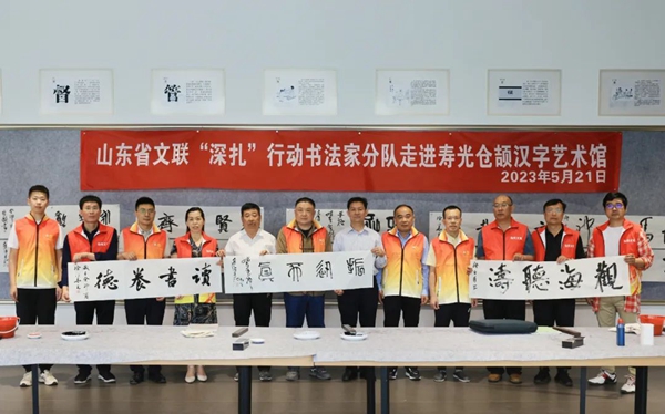 5月21日上午,在第10个中国文艺志愿者服务日来临之际,山东省文联“深扎”行动书法家分队来到寿光市屯田西村仓颉汉字艺术馆调研,同时开展“文艺进万家 健康你我他——与人民同行•2023山东文艺志愿者在行动”主题活动。