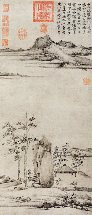 故宫博物院藏其《林亭远岫图》,题作于癸丑(一三六三)夏五月初十。虽是盛夏,画中却是枯槎当立,学李成法,以湿笔画出的碎枝,更见冷寒之状。远目遥岑,也是气象萧森。颇有他评李成画所言“林木苍古,山石浑然,径岸萦回,自然趣多”的意味。