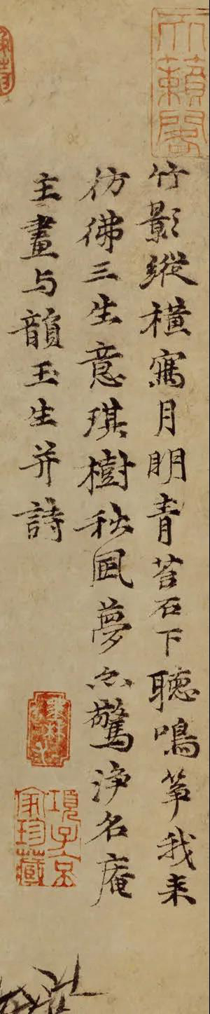 [16]此作当为云林真迹。云林后人倪珵所辑《清閟阁遗稿》卷五(万历刻本)中收有此诗,诗题与此款同。李日华《味水轩日记》卷六也著录此画,竹懒翁曾见过此画。汪砢玉《珊瑚网》卷三十四、卞永誉《式古堂书画汇考》卷五十著录此作。此画曾经清内府所藏,康熙时曾归耿信公。