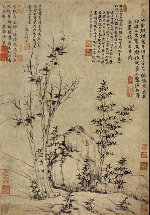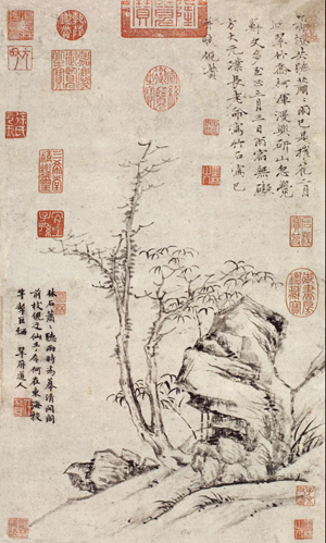 北京故宫博物院藏其《竹枝图卷》,是其传世名迹。我曾见此真迹,真有不凡的气度。此画为好友、音乐家陈惟寅所作,二人久日不见,“暮春之辰,忽过江渚,出示新什,相与披咏,因赋美之”[11],云林还作了这枝竹。这幅画画一枝竹斜斜地伸展于画面。自题云:“老懒无悰,笔老手倦,画止乎此,倘不合意,千万勿罪。懒瓒。”晚岁是作品。画塘乾隆题诗倒是透出值得重视的问题:“一梢已占琅玕性,千亩如看烟雨重。”此画可以说是得竹之“性”,表现画家真实的生命感受。所谓一竹一世界也。外形的描绘(形),动力模式的追求(势),以至生机活泼意象之呈现(韵),都不能概括如云林竹画这样的创作倾向,它是“性”之呈现,不是指外物(竹)的根性,而指表达人当下直接的体验,于艰虞之中寓生命信心。