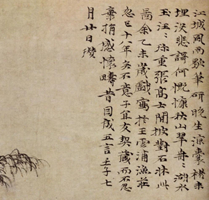 余与宗晋道兄别十有六年矣,忽邂逅吴下,杯酒陈情,不能相舍,老杜所谓“夜阑更秉烛,相对如梦寐”者,讽咏斯语,相与怆然。人生良会不易,而况艰虞契阔若此者乎!以十余载而仅一面,则人生果能几会耶!悲慨亦未有若此言也。明日道兄将归钱唐,余亦鼓柂烟波之外,因写图赋诗,以寓别后恋恋不尽之情云耳。