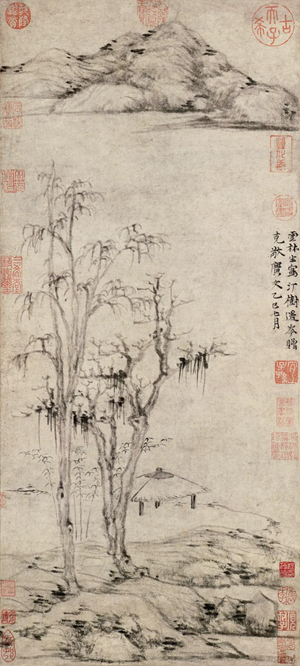 倪瓒通过他的绘画创造和对生命的觉解,建立了一种独特的“云林规范”。绘画是空间艺术,绘画的视觉形式,除了包括长宽高等空间因素外,还有一重要因素,就是时间。空间是在时间变量中展现的。我曾有专文讨论过云林绘画的空间创造,[2]这里再从时间角度来谈对“云林规范”的一些粗浅认识。