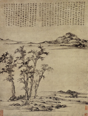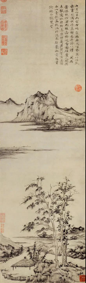 藏于上海博物馆的《渔庄秋霁图》,董其昌认为,为云林极品,[21]安岐认为,此画为云林“绝调”[22]。图作于一三五五年,一三七二年云林重题此图。画面中央近景处,焦墨画平峦上枯树五株(所谓孤桐只合在高岗),向空天中伸展,体势昂扬。中段空景,以示水体。向前乃是沙岸浦溆,以横皴画远山两重,约略黄昏之景。这当与他在太湖边生活的视觉经验有关,站在近岸,朝暮看太湖远山,就有这样的感觉。而这又非视觉经验的直接呈现。“悲歌何慨慷”(云林题此画语)—江城暮色中,风雨初歇,秋意已凉,正所谓袅袅兮秋风、洞庭波兮木叶下,云林于此画一种悲切,一种高旷,一种乾坤了望眼、幽意自彷徨的精神。意度主宰着画面空间的选择,不是由江岸视觉源点的远望所及,只是突出树、石等符号,略去种种(包括小舟、行人、暮色中的鸟),虚化种种(陂陀中的沙水,也非目击下存在之样态)。一切皆出于意度衡量之需要,需要在苍天中昂藏得法的高树,需要一痕山影的空茫,就尽意为之,而题诗中所说的“翠冉冉”“玉汪汪”等,一无踪迹。[23]画与王云浦的渔庄实景并无多大关系,系一种精神书写。