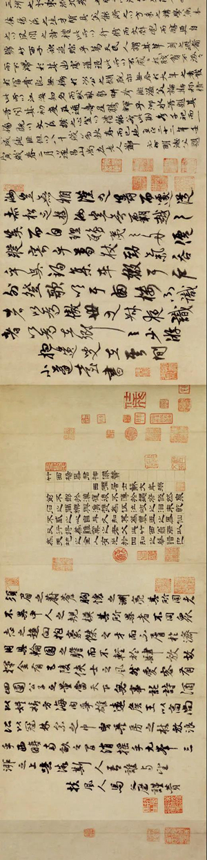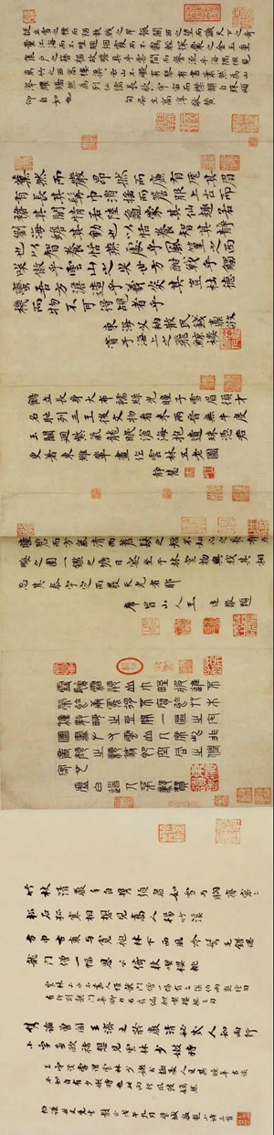 云林绘画的视觉形式难懂,但并没有影响后代艺术家、包括大量喜欢云林的普通读者去接近他的世界,这其中有一个重要原因,就是题跋的存在。文人画的视觉空间往往是诗、书、画、印的统合体,以云林为代表的元代艺术大家在这方面表现更为突出。就今天存世的云林真迹来说,一般都有自跋,不仅如此,云林还有一画多跋的习惯,在不同时间点见到自己的画,会作文字的记录。有时又对别人题跋再加跋文,说明因缘。云林的清閟阁,与顾阿瑛的玉山、曹知白的云西草堂,是当时著名的江南三大雅集之所,云林一生结交数以百计的朋友,常常与友人一起作诗作画。他的很多画作于与友人相会当顷或稍后,画中多有朋友题跋,包括当时文坛胜流(如虞集、柯九思、黄公望、王蒙、吴镇等)。诗、书、画、印的结合,留下深具意味的空间形式。自跋和他人题跋的叠合,记载着很多鲜活的场景,镌刻着他们对于艺术和人生的理解,这对于理解云林艺术作品本身带来了很大方便。