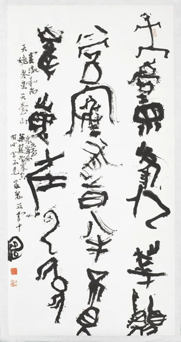 写铁线篆,须气静,蓄势蓄力,有耐心,有韧劲,方能笔笔圆润、笔力遒劲。杨涛君的铁线篆脱胎于李斯《峄山碑》、李阳冰《三坟记》、唐人《碧落碑》等经典碑刻;大篆则根植于三代吉金文。因此,他笔下铁线篆的刚健婀娜与大篆的厚重恣肆,以及隶书行笔的波磔熔为一炉。线质扎实、劲健、苍深,用笔峰峦起伏、迟涩飞动。不仅如此,他的草书以唐人狂草为本,兼及宋人草书韵致,取法高古,自有逸气。
