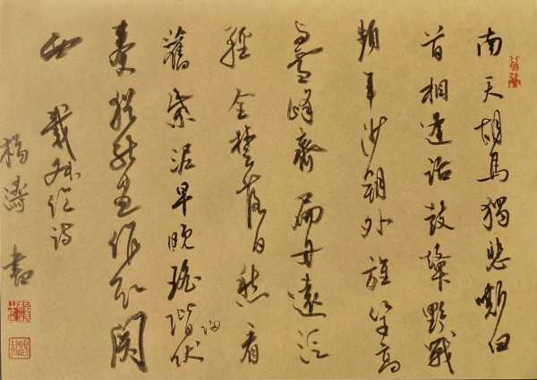 在此引用一句杨涛自己的话:“书法是千百年来中华精神的诠释和物化”,他要“借有为之手唤醒真切,独朗真心,洞照心原……”至此,已足见书翁之意不在书,乃在文化与思想。这正是当下书坛极为可贵之处。书以载道,无道何以成书?哲思、文辞、书艺,乃至画境在交融中形成一片化机,可谓书法之至高境界。由此,也可以说,在杨涛君的书法世界里,有了浓郁的形而上意味。在通往这高渺的艺术之境过程中,他找到了无限宽广的空间。他踏实地在现代生活的体验中,感悟时代审美的内在需要,以一步一石的追求,实践着其风神独赏的书法之梦。
