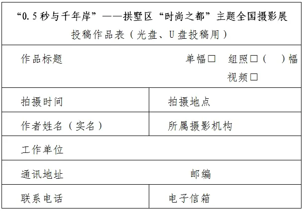 投稿者须在诠摄汇网“参展”专区(dz.cppfoto.com)“拱墅区全国摄影展”中注册,并按要求填写真实个人信息。主办单位保证不公开或泄露投稿个人非公开信息。投稿作品为JPG格式,图片统一处理为长边1000-1500像素,文件大小控制在500KB-1MB以内。