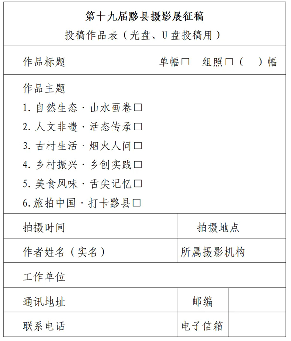 投稿作品以光盘(CD-R或DVD-R)、U盘存储形式邮寄至:北京市东城区东四十二条48号中国摄影报社活动项目部“第十九届黟县摄影展”办公室收(100007)