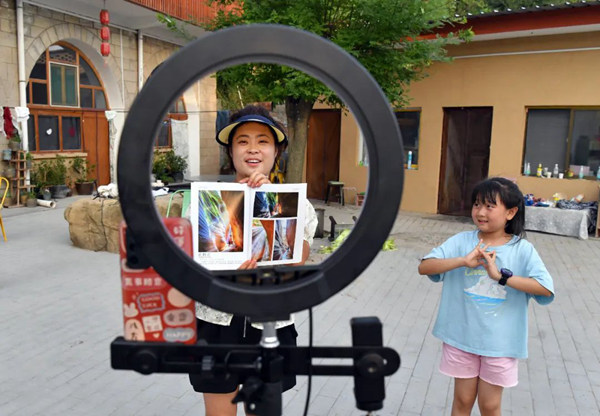 2022年8月13日,甘泉县下寺湾镇张家沟村的返乡创业女大学生郭延凤通过网络直播推介家乡的大峡谷风光。随着当地旅游产业的发展,郭延凤于四年前开办了窑洞民宿,走上致富路。居杨 摄