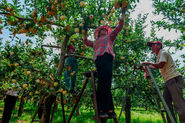 2022年8月11日,陕西宜川县云岩镇辛户村苹果种植户张东和家人在自家60亩果园里给苹果去套,望着快要成熟的苹果,6岁的女儿张泽析露出了幸福的微笑。柳军 摄