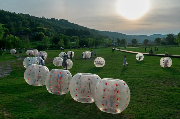 2022年8月15日,铜川市耀州区石柱镇马咀村欧洲风情小镇的孩子。马咀村群众通过努力奋斗完成了从“烂杆村”到“水泥村”到“生态村”再到“旅游村”的四级转变。王守钢 摄