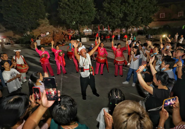 2022年8月11日,在陕西省延安市宜川县知青文苑酒店,当地村民组织的表演队在篝火晚会上为游客演唱陕北民歌。近年来,当地借助丰富的旅游资源大力发展特色旅游,带动村民走上致富路。杨登峰 摄