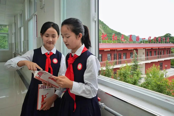2022年8月15日,陕西省铜川市照金北梁红军小学两名学生在阅读红色书籍。付锐 摄
