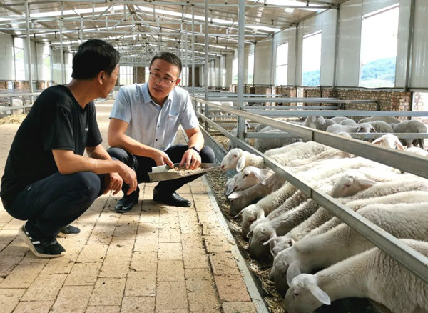2022年8月13日,曾获得“全国脱贫攻坚先进个人”荣誉称号的甘泉县石门镇魏家沟村第一书记崔院强在魏平养殖农民专业合作社现场指导村民养羊技术。王学峰 摄
