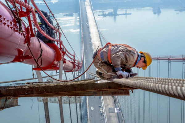 2017年11月27日,在杭瑞洞庭大桥西端主墩离湖面二百多米高的“猫道”顶端,施工人员拆除最后一片面网,大桥进入桥面施工的最后阶段。杨一九 摄