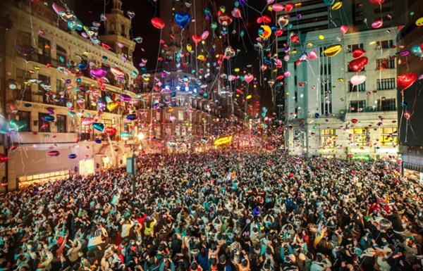 2021年12月31日,伴随着跨年的钟声,湖北省武汉市江汉路中心广场上的人们放飞手中的气球,迎接新年。陈卓 摄