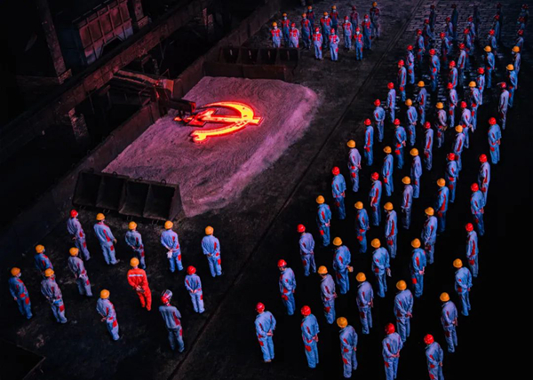 2020年7月14日,中信锦州金属股份有限公司党员干部围绕在一枚直径3米、中锰钢浇铸的中国共产党党徽周围,开展党日宣传活动。王乃功 摄