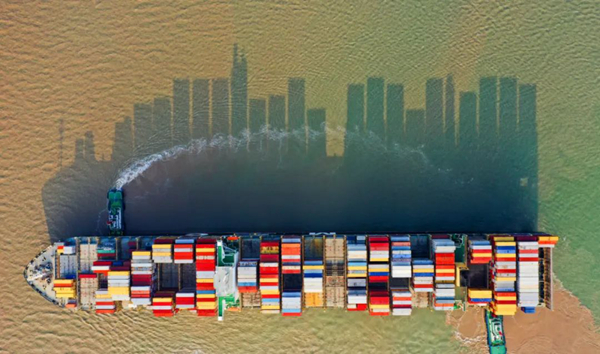 2019年10月4日,一艘满载集装箱的货轮缓缓驶离上海洋山深水港码头。船身与装载的集装箱倒影映照在东海海面上,仿佛一座移动的“海上城市”。计海新 摄