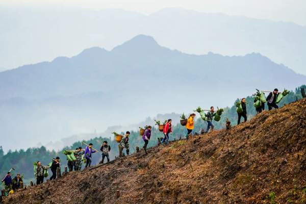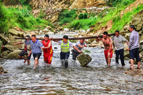 2019年6月30日,位于桂黔交界大苗山腹地的乌英苗寨,驻村干部带领村民维修河堤。当地干部群众齐心协力,艰苦奋斗,乌英苗寨于2020年实现整体脱贫摘帽。黄孝邦 摄