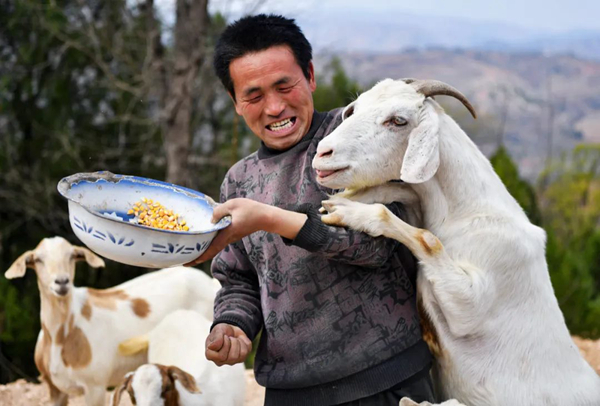 2019年3月27日,河南省卢氏县沙河乡果角村村民任当锋在喂羊。2018年,他在当地金融扶贫政策的支持下返乡创业,从打工仔变成羊倌。李嘉南 摄