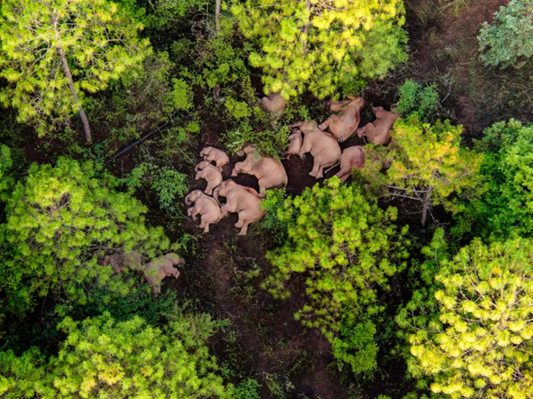 2020年3月至2021年9月,16头野生亚洲象从云南省西双版纳傣族自治州启程,一路向北,突破有记载以来我国亚洲象传统栖息范围。2021年6月13日,“吃喝玩乐”了一夜的象群在休息。段孟抄 摄