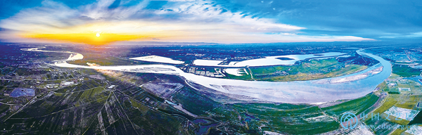 内蒙古不仅有草原与沙漠,河流资源亦非常丰富,这里流淌的母亲河——黄河,以及莫日格勒河、乌拉盖河、黑河、额尔古纳河……对摄影创作者而言非常“友好”:大部分流经内蒙古的河流都蜿蜒曲折,两岸植被茂密,非常适合创作出优秀作品。在展览中,张世瑜拍摄的《黄河之水天上来》、李颖拍摄的《河水映蓝天》,以及祝宝钟创作的《落日额尔古纳河》,以广角镜头、长焦镜头或者航拍手法取景河道局部,表现弯曲宽广的河道,同时呈现河道环境的生态之美。