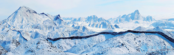 其次是绵延之大美。在时间单向度绵延的横轴中,草原上每一种历史的遗存,都锚定着曾经的存在,让我们走进历史深处。这向前无限延伸的探寻,与今后时光的流逝一起,让我们的思绪衔接。如作品《阿斯哈图奇观》让一抹霞光照亮一个地质年代,让山峦起伏的绿色中,有了沧海桑田的变幻;如作品《黄河之水天上来》,一条大河曲折绵延,从古至今,“今人不见古时月,今月曾经照古人”,这条河本身就是时间的象征;如作品《小佘太秦长城》,展示的是“雪落在中国的北方”之后,“白茫茫大地真干净”的情景中,有一条明晰的黑线,绵亘于山峦之脊,仿佛穿越历史的一根针,在新时代出现。