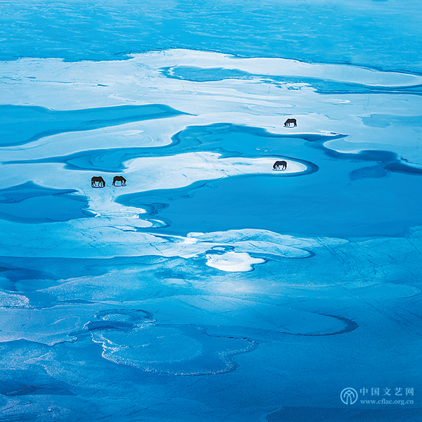 在展览中,同样留给观众深刻“印象”的,应该是众多反映人与动物、人与自然和谐相处的生动图景。薛新玉的《温馨的牧场》、包长明的《快乐家园》、额博的《美丽的草原我的家》、梅长华的《牧马晨歌》、杜文光的《舞动的草原》,展现连绵起伏的山峦,开阔平坦的草地,蓝天、白云、骏马、牛群,共同演奏出一曲悠扬高远的草原牧歌。巴义尔的《黑牛穿越》、张德山的《草原牧歌》、张全利的《骆驼骑手》、陈桐的《牧马人》、郎立兴的《驯鹿人家》等作品,更注重动物与人的互动场景,那些或觅食或转场的景象蔚为壮观。更令人印象深刻的是郁青拍摄于呼伦贝尔市鄂温克旗的《冬日的美丽》,月光、草原、河流成为满幅的色阶不同的“光亮的蓝”,四匹骏马在这个神秘的场景之中觅食休憩的场景,美得令人惊心动魄。