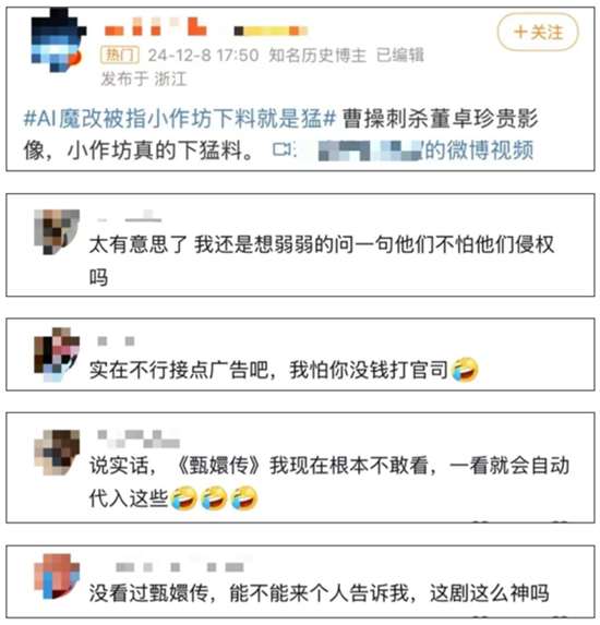 这些短视频在博得网友一乐的同时,也收获了不少粉丝。据媒体报道,有的自媒体,用AI做了42个“魔改”《甄嬛传》的视频,捕获了18万粉丝;某平台上的一个“魔改”《甄嬛传》短视频,获得点赞26.3万、转发56.4万,视频还插入了广告;在“魔改”热度的推动下,平台上也出现了大量如何用AI“魔改”影视作品的教程。
