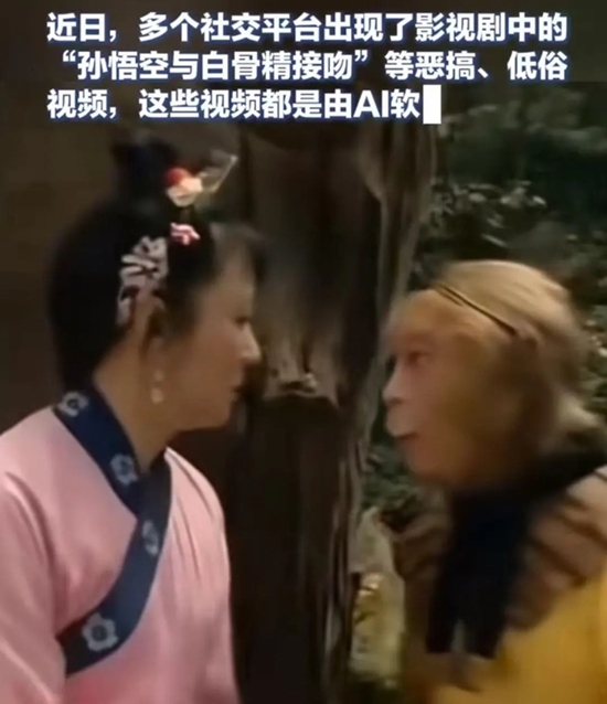 此前,“AI接吻”技术也曾在社交平台引发争议。不少网友发出的视频中,出现了唐僧和女儿国国王、孙悟空和白骨精等人物拥抱接吻的恶搞低俗视频。
