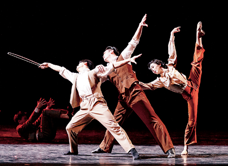 从舞剧的性格塑造始于田汉又归于田汉来看,聚焦湘人田汉是湖南省歌舞剧院为庆祝中国共产党成立100周年时创作选材的初衷。但显然,在主题的提炼上,舞剧《热血当歌》正如剧名所示,即将高潮定位于《义勇军进行曲》的创生。该剧自首轮公演后,在不断地演出中不断地加工、提升,成为一部比较成功的舞剧佳作。主创们深知舞剧叙事的关键所在,是扭结好田汉与聂耳这对“国歌”词、曲作者的关系,特别是如何在分述两人各自的人生路径之时,使两人的“交集”成为舞剧叙事的主线。这是我们对该剧作为舞剧佳作的第一个认识。与之相关联,在田汉与聂耳“交集”之时,田汉与安娥的“交集”其实更为紧密,是那种战友兼恋人的“紧密” 。不过主创们清醒地认识到,鉴于主题表达的要求,不宜过多地为两人设计花前月下、卿卿我我。同时增设“小报童”一角以丰富对聂耳的人生表现,促进人物之间在“救亡”立场上的奋起也是十分有益的。这是我们对该剧作为舞剧佳作的第二个认识。对该剧作为舞剧佳作的第三个认识是:该剧选择了《卡门》《四季歌》《扬子江的暴风雨》和《风云儿女》(主要是其中的《义勇军进行曲》)作为“戏中戏”加以表现,不仅结构了田汉艺术创作的人生进阶,而且,形成了舞剧独特的表意理念和叙事模态。最后对该剧作为舞剧佳作的认识还体现在编舞方面——田汉与安娥的双人舞、聂耳与小报童的双人舞都表意准确、编排流畅;田汉、聂耳、安娥创作构思的三人舞以及田汉等三人与小报童哀念惜别的四人舞也是情思浓烈、设计新颖;特别是“戏中戏”《卡门》和《四季歌》中先后两段女子群舞,融“戏剧性”于“舞蹈美”之中,让观众从极具观赏性的“舞蹈美”中,感受到思想的启迪和情感的震撼。可以说,舞剧《热血当歌》是一部新时代“与时代同行,与人民同心”的舞剧佳作。