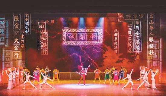 背景上各种竖垂的牌匾旋绕而出,小到隆金记大金行、银都鱼翅酒楼、金山华人服务社,大到锦江饭店、美西银行、美洲协胜公会……从横贯大街的“中国城”牌匾来看,这里是大大有别于时代广场的纽约唐人街——笔者想起了场刊上的描述:“唐人街是广东和岭南文化的缩影。这里的店铺、美食,都承载着华夏子孙对祖辈的传承与记忆……舞龙、醒狮、英歌等文化元素,也在唐人街上演着神秘与有趣的活报剧,吸引着无数目光。唐人街上的黄皮肤、黑头发的人,怀揣着中国心、中国魂,在这里坚守着自己的文化传统和信仰。”很显然,这是芭蕾舞剧《家园》想表达的一个主旨,而对于这一主旨的表达无疑会强化芭蕾这一外来舞蹈样式的“家园”特色——似可称为芭蕾“中国学派”和“岭南学派”的艺术追求。“中国城”很自然地出现了中国人,舞台上是十余对男子用肩膀扛着女子的舞者——这种造型之前并非没有,只是编导把芭蕾中坐肩女子的前“Attitude(一腿往前弯曲抬起的基本舞姿)”的姿态还原为中式生活中的“双腿并膝”……舞者们时而合成一周,又时而分成两圈,然后开始了“围场”表演——这应该是欢度热闹的“中国年”……十余名女子手持红色方巾登场,方巾上饰有金色的鳞纹;一男子高举竹骨扎制的龙头昂扬穿游,戴着翻飞的女式红方巾形成一段颇具芭蕾风的龙舞……龙舞盘绕中,一对红衣舞者在典型的“芭蕾双人舞”模态中呈现舞狮的韵味;舞台后区则是身着红、绿、蓝、黄色戏装的舞者,以双手持槌戛击的动态呈现出有“中华战舞”之誉的英歌……在这“每逢佳节倍思亲”的语境中,空间被切换到一间静谧、素雅的“如意酒家”;酒家里一位年长的女性正在翻阅一本文集,其中有一枚色彩依然的木棉花书签——这是阿辉的祖母,由书签遥想起家乡红火炽热的木棉花树,而那些“木棉花”叠化成一队腰系红绸的女子,身着淡蓝衣装的祖母也由此融入自己青春少女的时光……那6位腰系红绸的“木棉花”横躺于后区的平台前,舞动双足。坐在平台上踢动双足的祖母仿佛在家乡的溪流中拨动着清波——这段兼具“溪流”意象和“思绪”寓意的女子舞蹈,同样是在纯正的芭蕾舞风中散发出浓郁的岭南情韵……与“木棉花”共舞的祖母看到舞者腰系的红绸,情不自禁地由红绸联想起自己出嫁时的红盖头……在祖母的影像中融入一个矩形的框构,框构外阿辉的独舞传递出无尽的思念——这一刻我们忽然觉得,这段热闹“中国年”的欢度和手持木棉书签的祖母忆往,其实是已置身大湾区建设的阿辉的心念……作为舞剧的构思,这心念是一个动机,它让大洋彼岸的阿兰来到了大湾区;而阿兰将祖母时时翻阅的文集和那枚色彩依旧的木棉花书签带给了阿辉,阿辉则仿佛透过书签看到了祖母面容,他充满哀伤地将书签抛向空中——刹那间,矩形框构的屏中满天飞花,也寓意阿辉此刻繁乱的思绪……作为“一湾水,两地书”的空间交响,继前述“神遇”“惜别”双人舞后,此时有了阿辉、阿兰的第三段双人舞——看得出,这段双人舞中有两人对“家园”认知的分歧,分歧中阿兰将两人订婚的戒指痛心地交还给阿辉,带着拉杆箱和纠结心情离去……阿辉沉浸在内心的焦灼中,一股强烈的戏剧性感受在观众心中弥散开来……