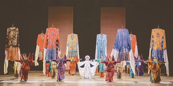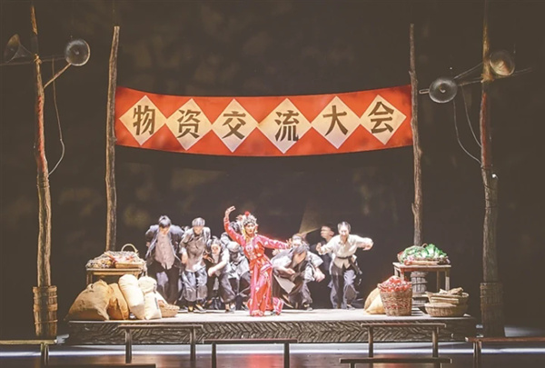 关于舞剧的“二幕”,场刊的表述是:“20世纪70年代中。老戏解放,天时地利人和,忆秦娥成角。忆秦娥初恋封潇潇,但是却爱而不得。”在笔者看来,“二幕”只是一个导向“三幕”的“过场戏”;从舞剧叙事的“戏剧性”而言,对二、三两幕可以合而论之。场刊对“三幕”的表述是:“20世纪80年代。改革开放,商品经济,秦腔为其搭台唱戏。成角儿的忆秦娥亮眼,刘红兵慕其财色而穷追,终以舆论而挟持成婚,但是其婚姻却解体。西方文化的冲击,秦腔势衰,忆秦娥茶馆演唱,再成‘搭红’的对象。”“二幕”幕启,乐音中“秦腔”吼起来。台中后区有一条板凳,坐凳者以双手虚拟击板鼓状,凳后6人配合默契,宛如小型的伴奏乐队开启了正剧的前奏。切光后空间转向舞台,一台大剧正奔向“高潮”——8位武生“靠旗”凛然,红紫衣装神采奕奕;8位正旦“垂辫”轻漾,蓝绿衣着逸态悠悠……对于将要登台的忆秦娥而言,这部大剧的“高潮”又仿佛一个“前奏”。舞台暗转,天幕影像跳闪切换,忆秦娥在脸谱勾描、服饰披戴中静候出场,而天幕下的舞台后区也排列着貌似“拣场”的束装男子……忆秦娥一袭白裙绰约闲靡,机迅体轻,蜲蛇姌嫋,云转飘忽——以“白娘子”的扮相诠释着“主角”的意涵。此时,天棚降下若干巨大的“戏服”,貌似“拣场”的束装男子如操持“杖头木偶”般让“戏服”的长袖飘拂,让“老戏解放”如“彩练飞舞”。灯光渐渐压暗,“淡淡妆,天然样”的忆秦娥和封潇潇仿佛从戏里走到戏外——无论是大圈追逐还是小圈凝注,两人却始终未能“牵手”,一如剧中的白娘子和许仙……音乐中裹挟着嘈杂的叫卖声,当“物资交流大会”的横幅在后区的小戏台上高挂之际,舞剧进入了“三幕”。各种摊贩在前区过场后,十余人挟着条凳来参加“物资交流”了。这段本为“铺底”的群舞,由于占据显要位置并放纵蓄积情绪而成为舞剧表现的“大潮”,身着红色戏装仍在饰演杨排风的忆秦娥被淹没在“大潮”的声浪中。一段老陕“rap”伴着十余人的“条凳舞”拔地而起:“一二一,花生米;吆二吆,鸡蛋糕……陕西愣娃一亮相,穷山恶水都得让;陕西愣娃一亮相,天大的困难都敢上……美不美家乡水,亲不亲来故乡人……陕西愣娃一亮相,罡板硬正响当当;陕西愣娃一亮相,一根筋来比牛犟……爱家乡来爱乡党,见了乡党泪汪汪……”领头的忽又喊起:“来段秦腔‘祖籍陕西韩城县’好不好?”随声附和后便吼起了秦腔:“祖籍陕西韩城县,杏花村中有家园。姐弟姻缘生了变,堂上滴血蒙屈冤。姐入牢笼她又逃窜,不知她逃难到哪间。为寻亲哪顾得路途遥远,登山涉水到蒲关……”在笔者看来,这段老陕“rap”和一段秦腔“生变”应该用字幕配合。因为这段经济“大潮”瓦解了忆秦娥的演艺“高潮”,显见的是其人生的又一“拐点”,“拐点”中出现了极其“物质”的刘红兵。或许他毕竟是忆秦娥的第一任丈夫,他围着忆秦娥“团团转”的哑剧性表演尽管极其“粗糙”,但占了很大篇幅。在观众的印象中,物质性的空间摆设和行动介质充斥着舞台。在时代经济大潮的裹挟、亦在刘红兵膨胀物欲的“绑架”中,倔强的忆秦娥此时爆发了她的全部“倔强”……尽管天棚降下一幅矩形框架,坐在条凳上的忆秦娥与刘红兵留下了一张“结婚照”,但随着框架的移去,忆秦娥“移步换形”而步入了茶馆……在茶客围坐的数张方桌之间,忆秦娥再次寻觅到自己的舞台——舞台中线两侧各有一排系着红绸的靠背椅,在戏腔韵白伴奏下正经历着“主角”向“搭红”的转型,而椅背上的“红绸”应该是导演不乏刻意的隐喻!