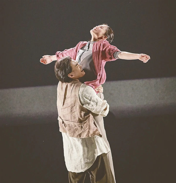 场刊上的“四幕”写道:“20世纪90年代。传统振兴,秦腔世界巡演。忆秦娥成了金皇后。画家石怀玉以秦腔画作撞入忆秦娥的生活,并酿成‘裸画’风波……悲乎!此时,敢爱敢恨的胡三元和胡彩香屹立于不羁。忆秦娥终难自处,愤而泼墨毁画。”乐音中板胡的旋律格外激昂,天幕的影像中叠映出各种剪报,无非是忆秦娥辉煌有加,成了秦腔“金嗓子”“金皇后”。但舞台上导演专注的是有关忆秦娥的舆论风波。5幅立式的矩形画板在舞台的“展厅”中游弋,画板上是忆秦娥作为秦腔“金皇后”的各种剧照,无不熠熠生辉、楚楚动人。在画板“游弋”不断重组的空间中,作为观众的舞者为画作“惊艳”的同时,也悄悄发酵着“舆情”……画板撤离后,披着粉色外套的忆秦娥与一袭白长衫套马甲的石怀玉临场了。终于,在两人久久地凝视后,我们看到了忆秦娥与石怀玉比较接近原本意义上的“双人舞”。想起场刊上“剧情概述”中的一段文字:“在忆秦娥的生命中曾经经历三段情感:一次是青春初恋,懵懂、美好却转瞬即逝;一次是被忠实戏迷穷追猛打到精疲力竭,无奈之下与之成婚但终究未能长久;一次是她以为找到了人生知己,却又彼此发生了观念与情感冲突,这场冲突也成为她命运的转折点……”在这段“双人舞”中,石怀玉总是不断地对着忆秦娥跳“飞燕”,对于剧中忆秦娥的三段情感而言,这还算是一段有意思的“双人舞”,是那种“语言”倾诉而非“技巧”炫耀的“双人舞”。当然,石怀玉最终还是抱起托起忆秦娥来“炫技”了,他甚至还情不自禁地“腾翻”起来,视忆秦娥为心中的“女神”。此时的忆秦娥在定位光的投照下纹丝不动,一边是舞台上石怀玉无比崇拜的“腾翻”,一边是天幕上碎片化的人体影像——如大众的闲言碎语。天幕上碎片化的影像在叠闪中已经有了“鞭笞”的意味,忆秦娥眼中的石怀玉居然也叠化出了刘红兵、封潇潇。作为忆秦娥的“心象”,这段独特的“四人行”可不可以在人生往事的追忆中形成一段独特的“四人舞”?至少笔者认为可以考虑。或许是考虑忆秦娥要面对的是更复杂也更险恶的舆论,王玫让现代舞多见的地面动作派上了用场,这不是忆秦娥抽搐的肢体而是她“哀莫大于心死”的“倔强”。王玫似乎不甘于此,她想用自己的理念实现一场“救赎”:在一段多次反复的如泣如诉的旋律中,舅舅胡三元与师父胡彩香临场了。或许是有至情至性的“真爱”在,这段全剧最丰足,也最为流畅的双人舞,不仅在救赎忆秦娥“自认不洁”的认知,而且在颠覆舞剧“何为主角”的认知。在笔者看来,胡三元与胡彩香从情态到动态都绝佳的双人舞,在表达“屹立于不羁”观念的同时,是否也会涉及一个“社会良俗”的问题?舞剧的“尾声”是最后的歌吟:“人聚了,戏开了,几多把式唱来了;人去了,戏散了,悲欢离合都齐了;上场了,下场了,大幕开了又关了……”虽然为舞剧《主角》保驾护航的业内顶尖主创还有原著作者陈彦、编剧罗怀臻和作曲赵博、舞美灯光设计任冬生、服装设计阳东霖、造型设计贾雷、多媒体设计胡天骥、道具设计金继峰等,但笔者却突然忆及既往王玫高调批评彼时舞蹈创作实践问题的文章《舞蹈之“以舞为本”的绝症》(《舞蹈》2011年第2期)。在她认定的舞剧编创“四重境界”中,最高境界是“深具内在经验,编创形式有独特贡献,故事讲得清楚”。以此来观舞剧《主角》,导演王玫应该还有很大的上升空间,相信北京演艺集团也由衷期待!