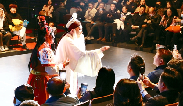 豫剧演出舞台变T台,曲艺“喷空”演员串场剧情,观众沉浸其中,演员融入观众,大家都成为精彩故事的一部分……3月13日,由中国剧协副主席、河南省剧协主席李树建领衔主演的小剧场精华版豫剧《程婴救孤》在河南艺术中心小剧场上演,颠覆性创意、沉浸式体验,让观众耳目一新,再一次实现了“老戏曲,新传播”。小剧场精华版《程婴救孤》全程融入河南曲艺“喷空”元素,非重要场次,由“喷空”团队演员串场讲述,重要场次则由李树建等豫剧演员精彩演绎。大胆将T台引入到小剧场精华版《程婴救孤》的演出,消除了演员和观众的距离,让观众有一种沉浸式体验。戏曲经典的新颖演绎吸引了众多年轻观众。3月14日、 15日,由李树建、李新伍、杜永真等主演的小剧场沉浸式豫剧《秦雪梅》《清风亭上》在河南艺术中心小剧场陆续上演。图为演出现场。