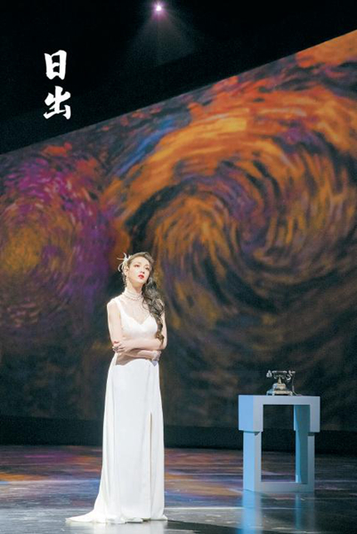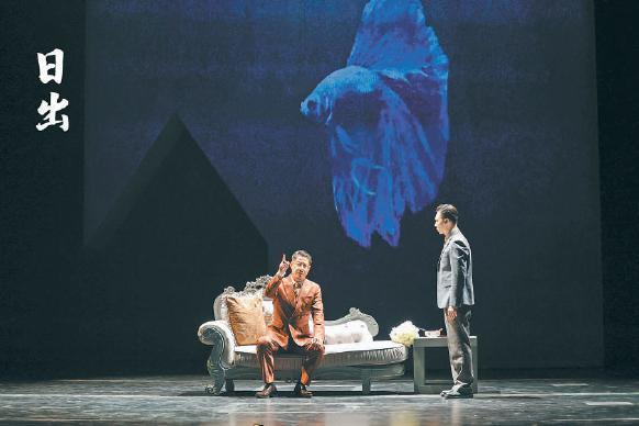 相比具有北京人艺特色的现实主义风格表演,这一版《日出》的舞美设计呈现出了写意色彩和创新追求。简约的舞台上,只有沙发、茶几等几样简单道具;后面的黑色几何形舞台背景,由一扇景片和两块纱幕构成,同时还可以打上投影,使得舞台表现形式更加丰富。上半场,巨大黑色背景上的投影,从抽象的霜花,变成一尾在鱼缸中缓缓游弋的鱼,象征着如同困在鱼缸中的剧中人,无力摆脱环境。下半场,舞台视频投影则用来呈现胡四在妓院中挑选的妓女。一张张巨大的女性图片出现在背景墙上,虽然凸显了底层女性只能被人像货品一样挑选的命运,但这样的手法令人觉得有些突兀。