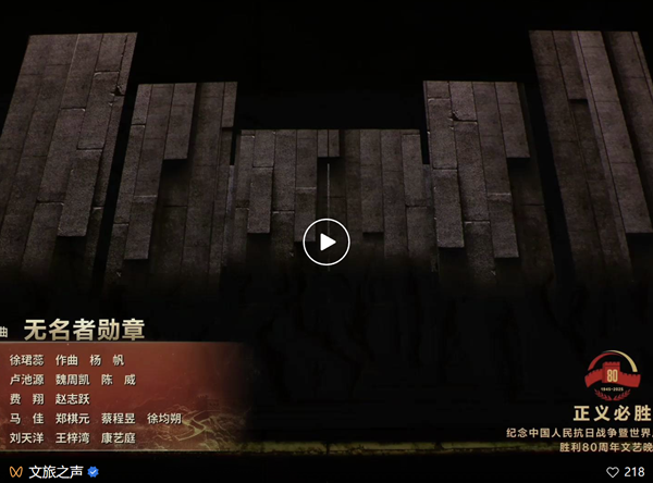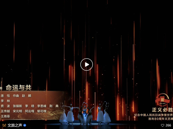 9月3日晚,纪念中国人民抗日战争暨世界反法西斯战争胜利80周年文艺晚会《正义必胜》在人民大会堂举行,用音乐舞蹈史诗剧的方式讲述中国人民的抗战故事。一个多小时的演出,音乐表达多元、层次丰富,承载、带动着澎湃厚重的情感脉流。