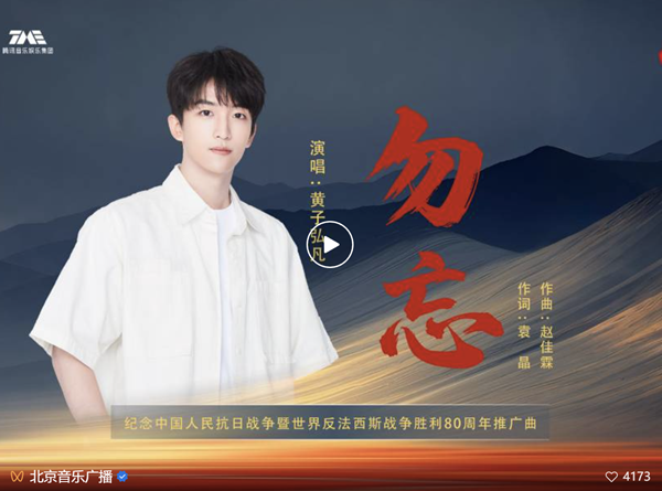 以诗意笔触镌刻历史记忆,歌曲《勿忘》在日本宣布无条件投降80周年之际上线,由黄子弘凡演唱,袁晶作词、赵佳霖作曲并担任制作人。歌曲以“追问”与“回响”为叙事主线,通过风与墙、雨与窗、路与故乡的对话,将战争的伤痕与和平的守望编织成充满生命力的音乐诗篇。
