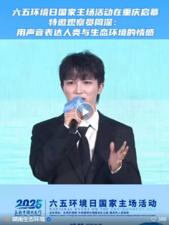 6月5日,在六五环境日国家主场活动现场,生态环境部公布了2025年度生态环境特邀观察员名单,歌手周深作为唯一文艺界代表获聘。周深在发言中表示,“美丽中国我先行”提醒每个人用自己喜欢的方式、擅长的技能参与到生态环境保护中来,从自己做起,从身边的点滴做起。他也将继续用声音表达人类与生态环境之间的情感。