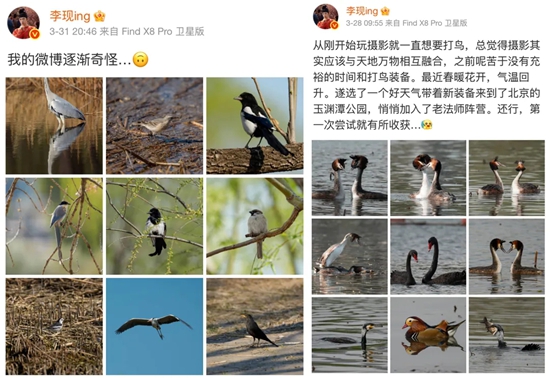 今年3月、4月,演员李现多次因“打鸟”登上热搜。在北京各大公园,李现扛起长焦镜头与摄影爱好者们并肩蹲守,用快门定格凤头鸊鷉求偶的涟漪、苍鹭捕鱼的瞬间,通过自己的镜头语言,将“打鸟”从“小众圈层”带入公共视野,也让众多网友在钢筋森林中重新发现自然之美。网友们纷纷表示:“李现的镜头带火的不只是鸟,还有大家守护生态的心”。