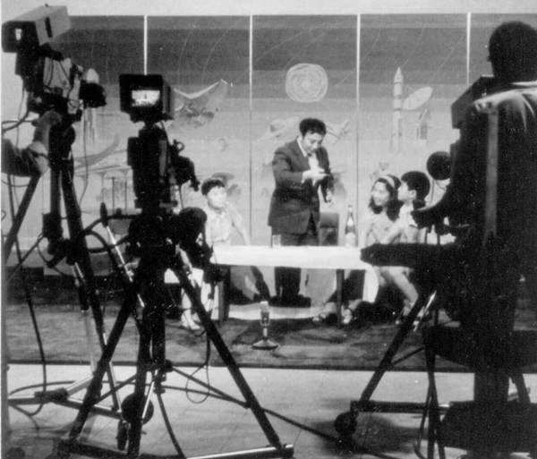 图为傅腾龙(左二)在央视少儿栏目《天地之间》讲解科学魔术